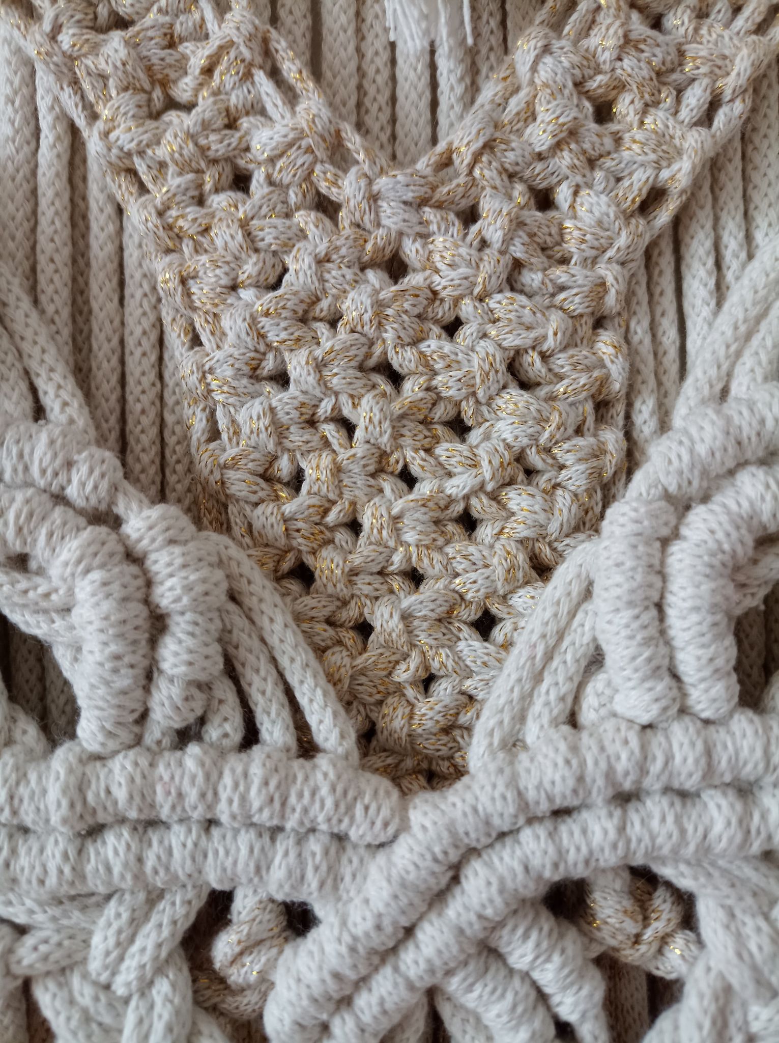 Makrama AURELIA to połączenie dwóch stylów: boho oraz glamour. Za sprawą sznurka dzianego ze złotą nicią pięknie mieni się zarówno w świetle słonecznym, jak i sztucznym.