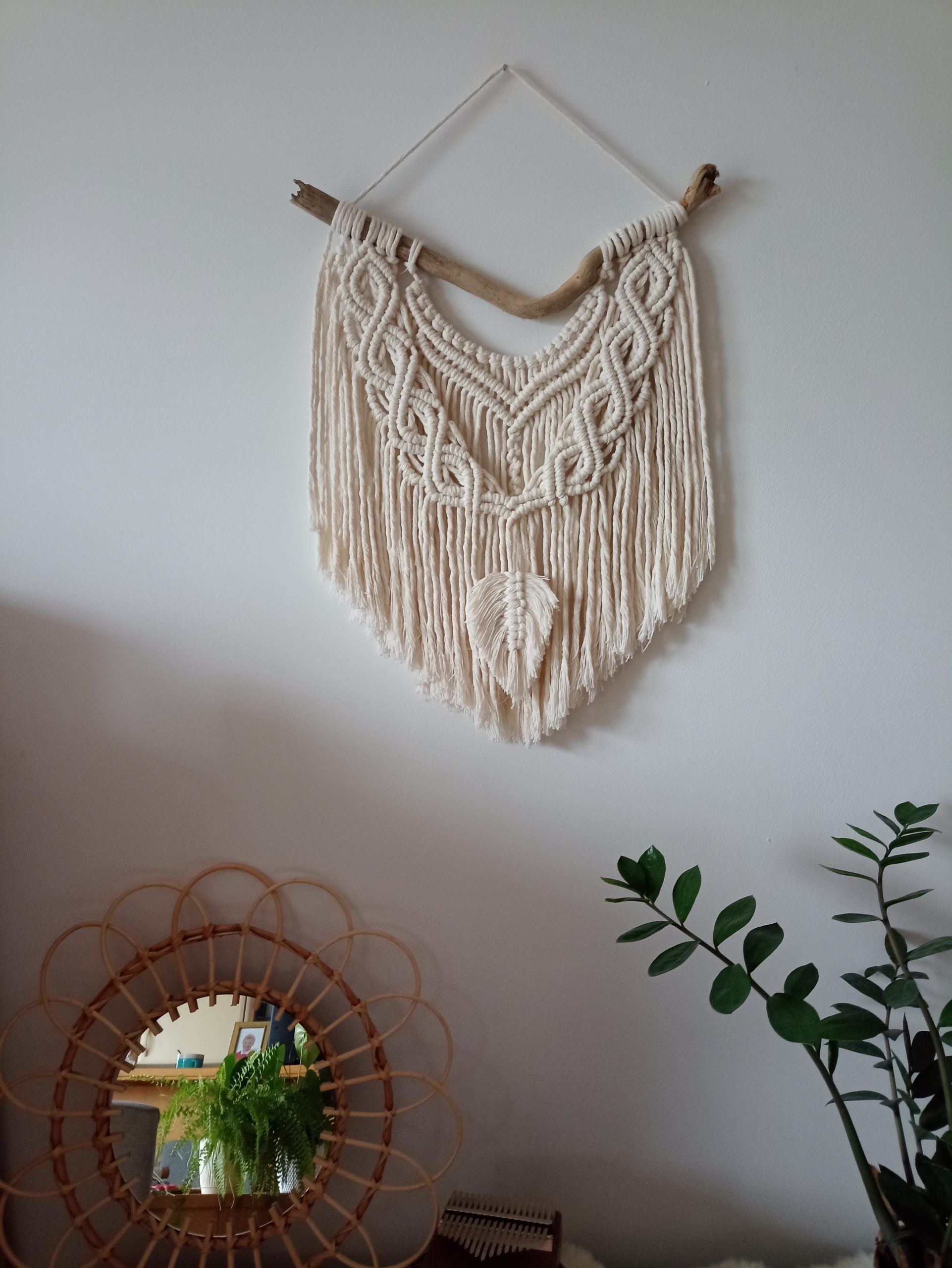 Naturalna makrama Gaia w kolorze złamanej bieli . Makrama (wykonana ze sznurka bawełnianego skręcanego o grubości 5 mm) jest wyjątkowym dodatkiem do każdego wnętrza nadając mu przytulny klimat w stylu boho.