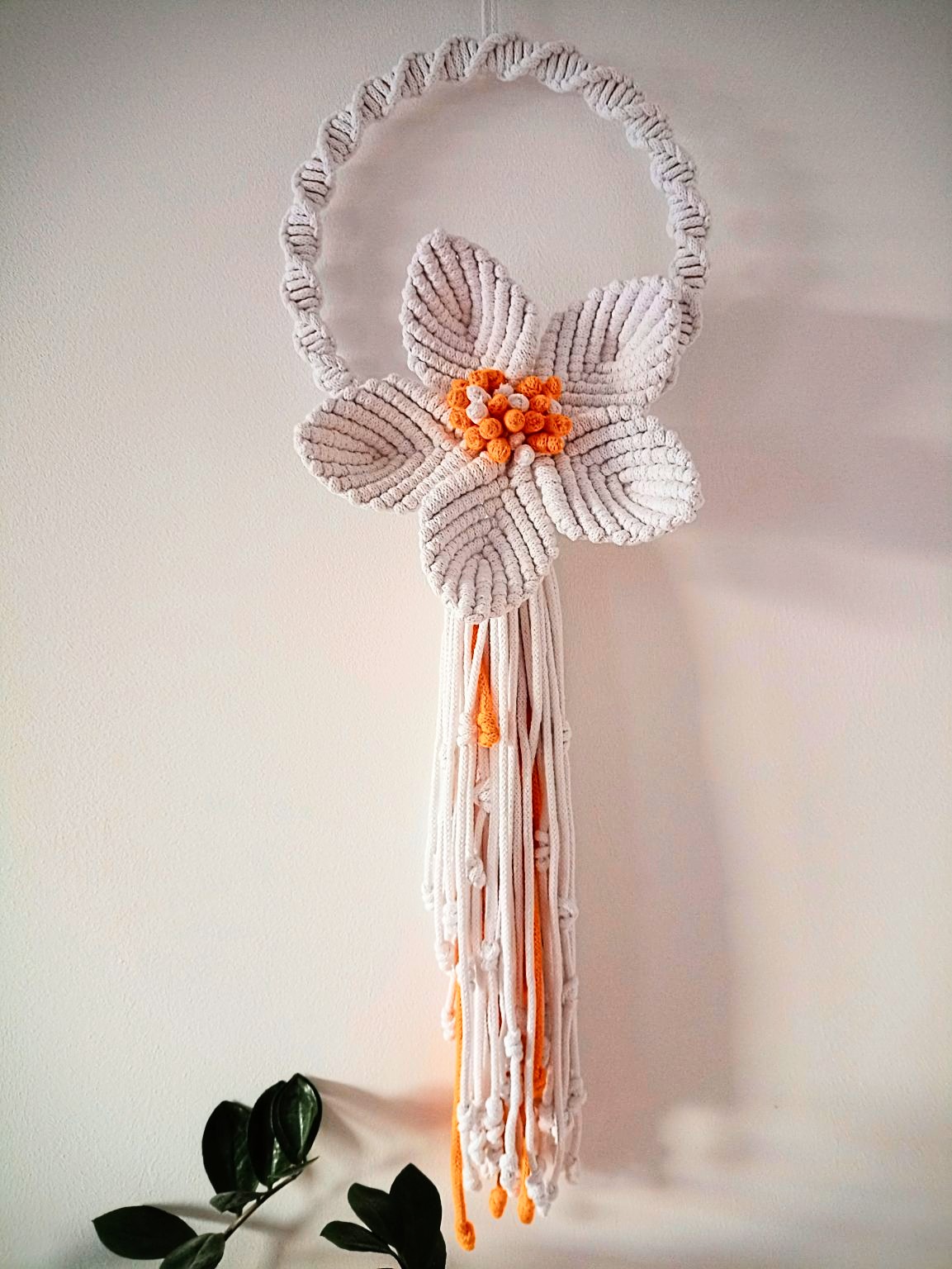 Makrama w formie kwiatu umieszczonego na okręgu to wyjątkowa wiosenno-letnia ozdoba, która nada wnętrzu lekkości i świeżości. Wykonana ze sznurka bawełnianego plecionego o grubości 5 mm w kolorze białym oraz żółtym (środek).