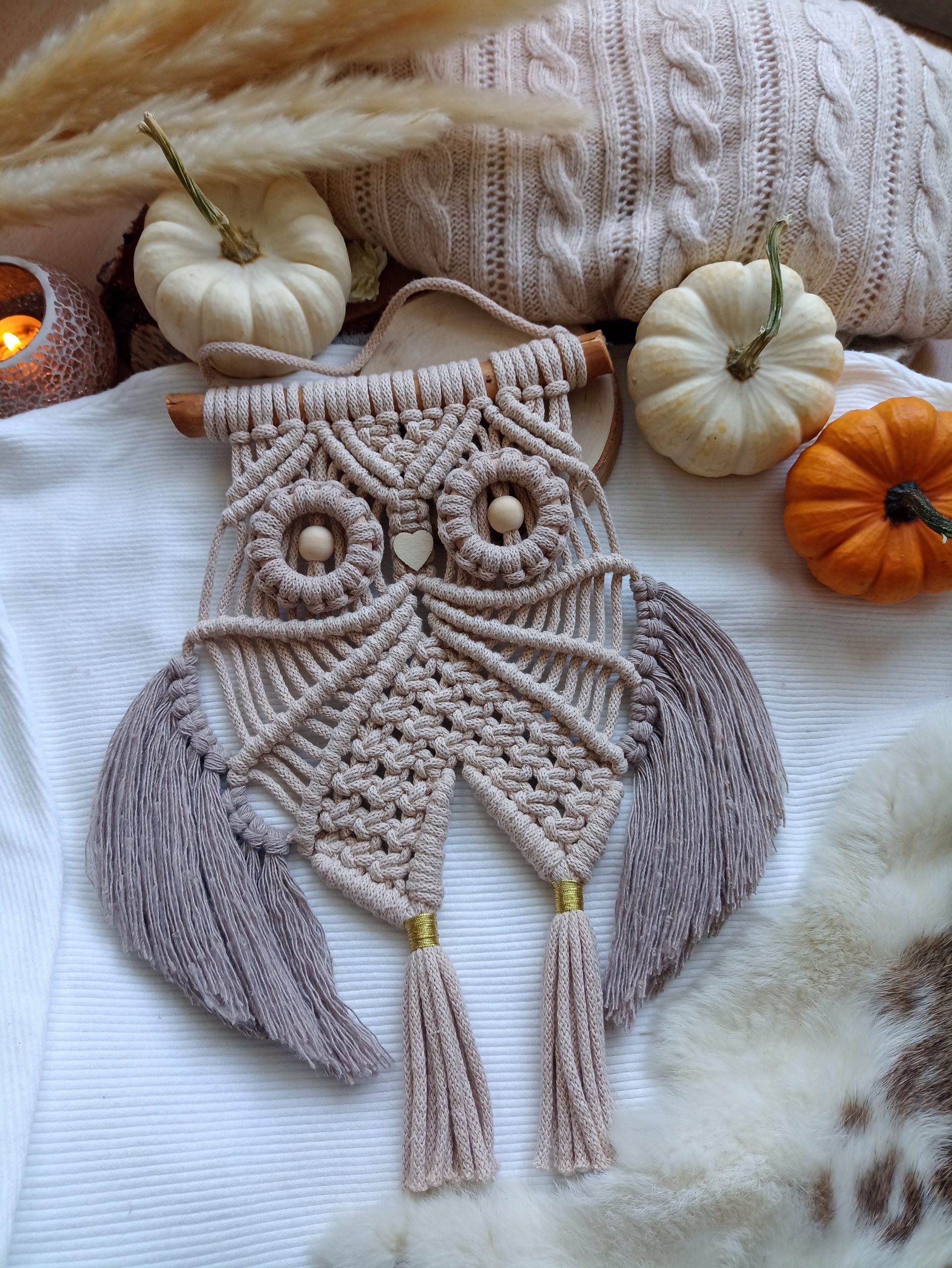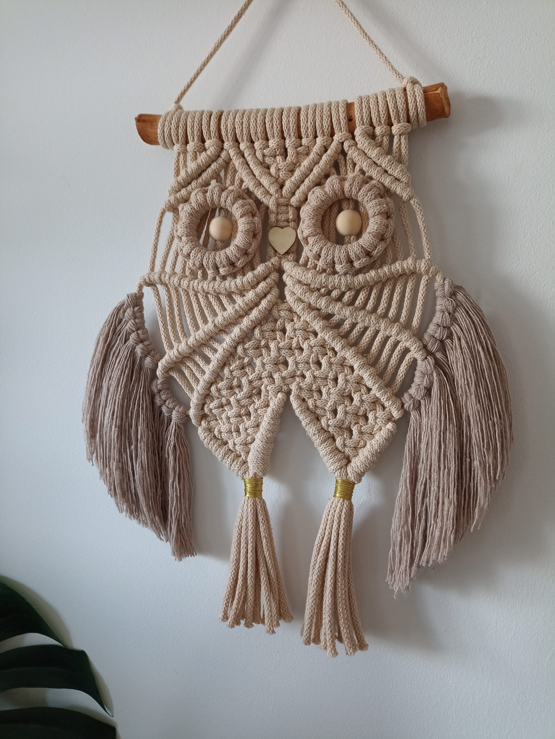 Sowa wykonana metodą makramy pięknie prezentuje się we wnętrzu w stylu boho, jak i również w pokoju dziecięcym.