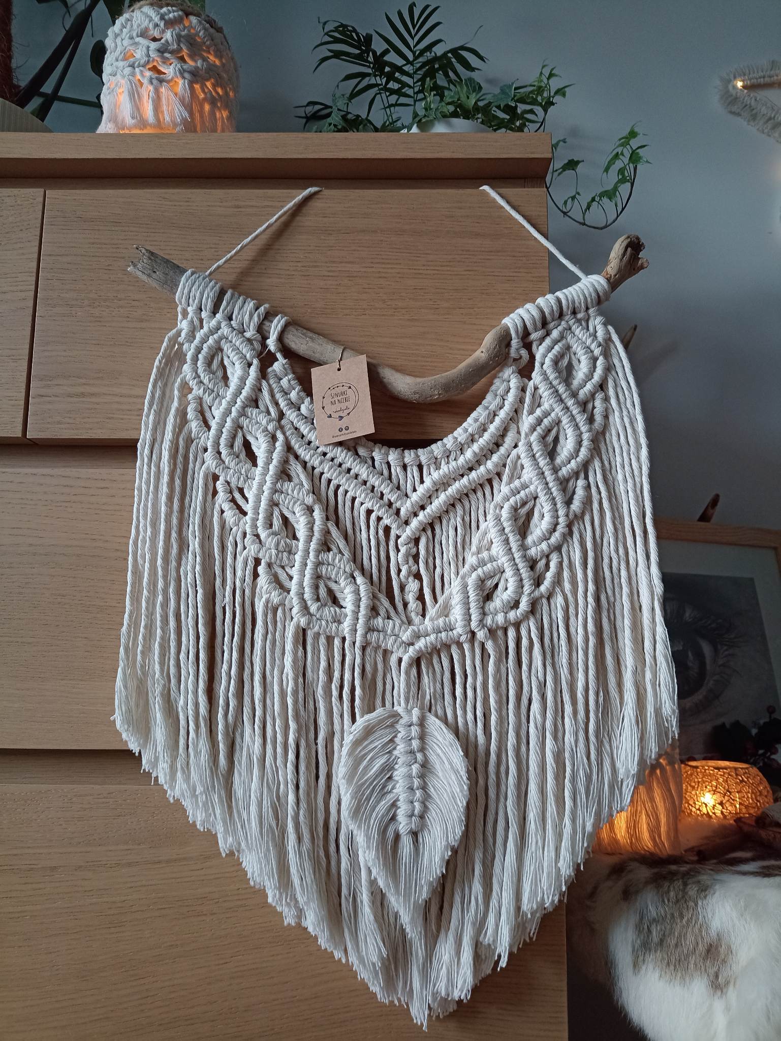 Ten wyjątkowy łapacz snów wypleciony został na drewnianym okręgu ze sznurka bawełnianego skręcanego w kolorze naturalnym (złamana biel).