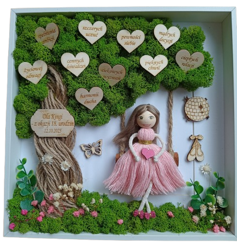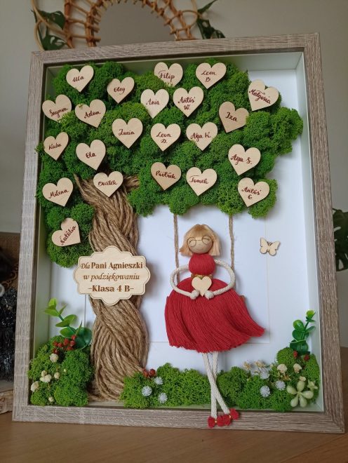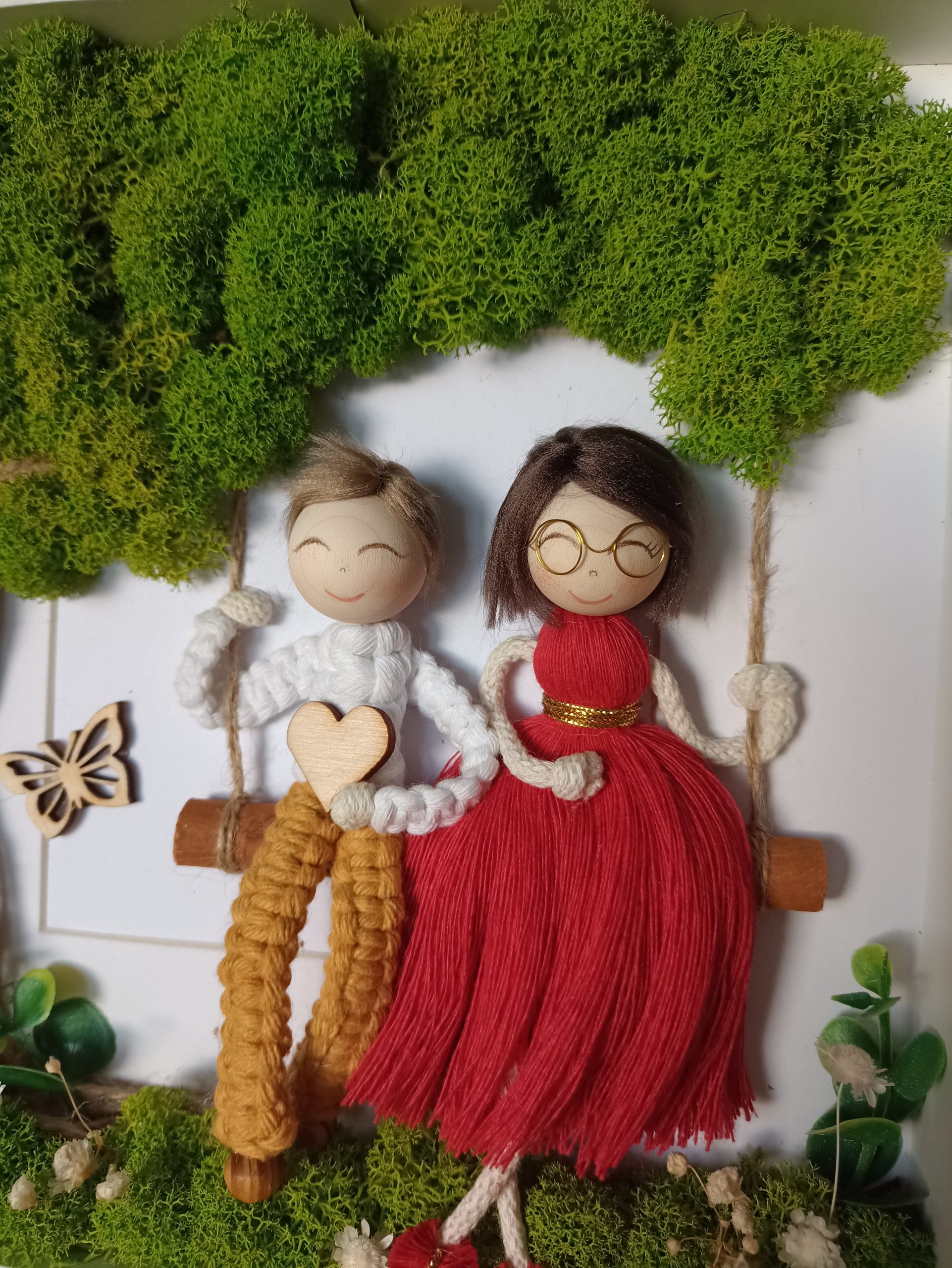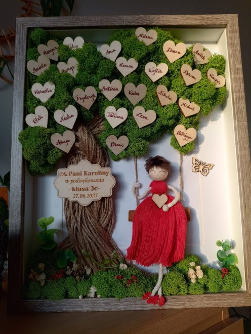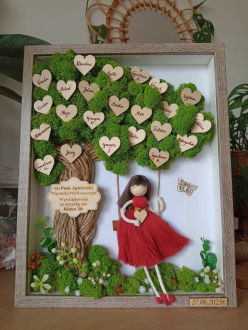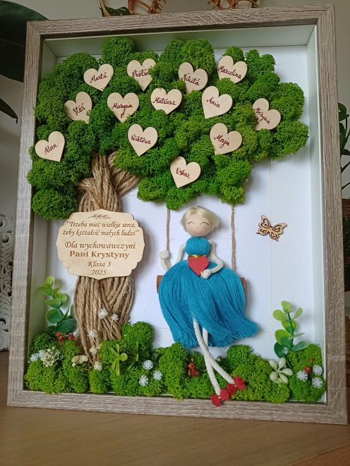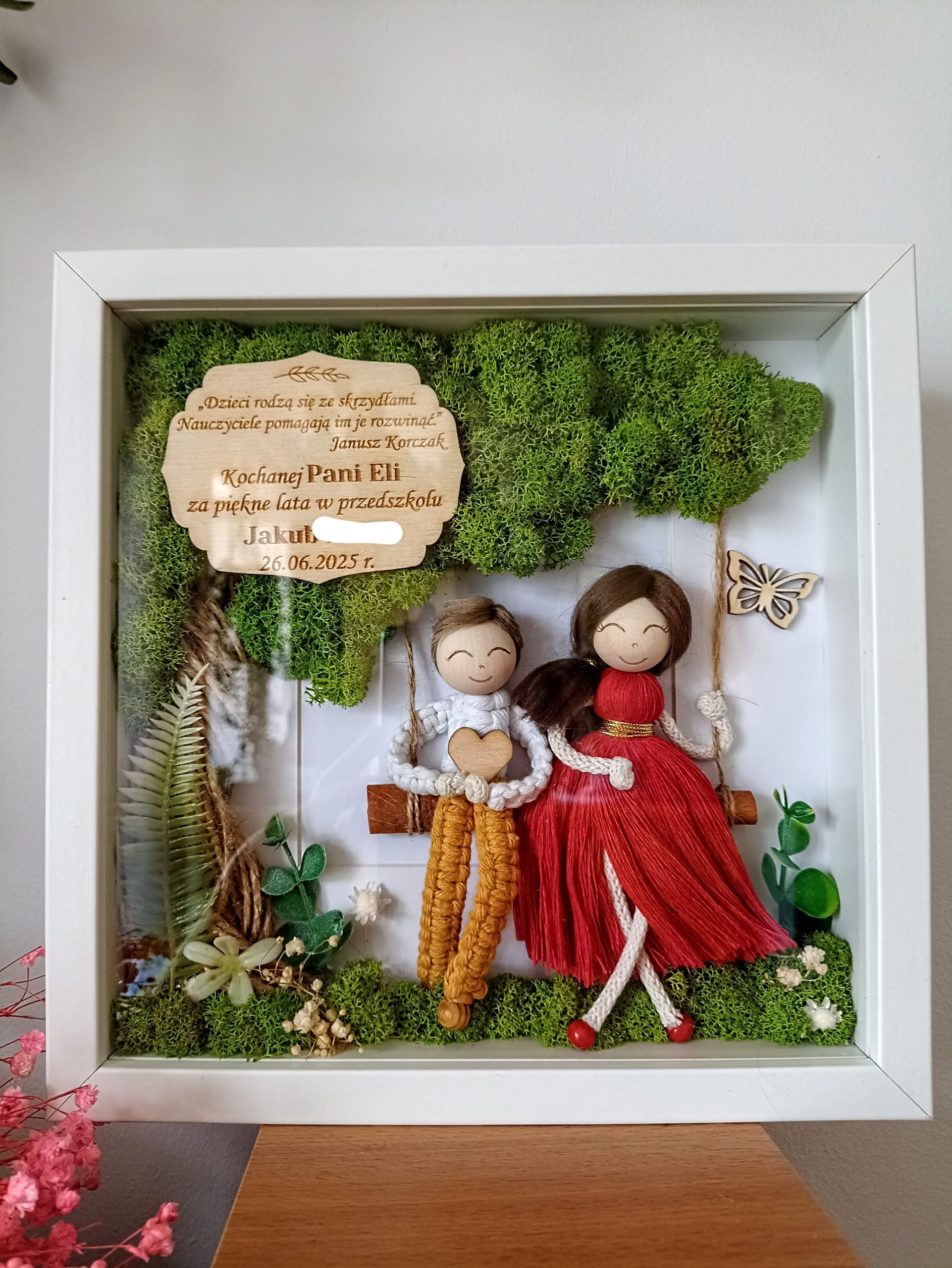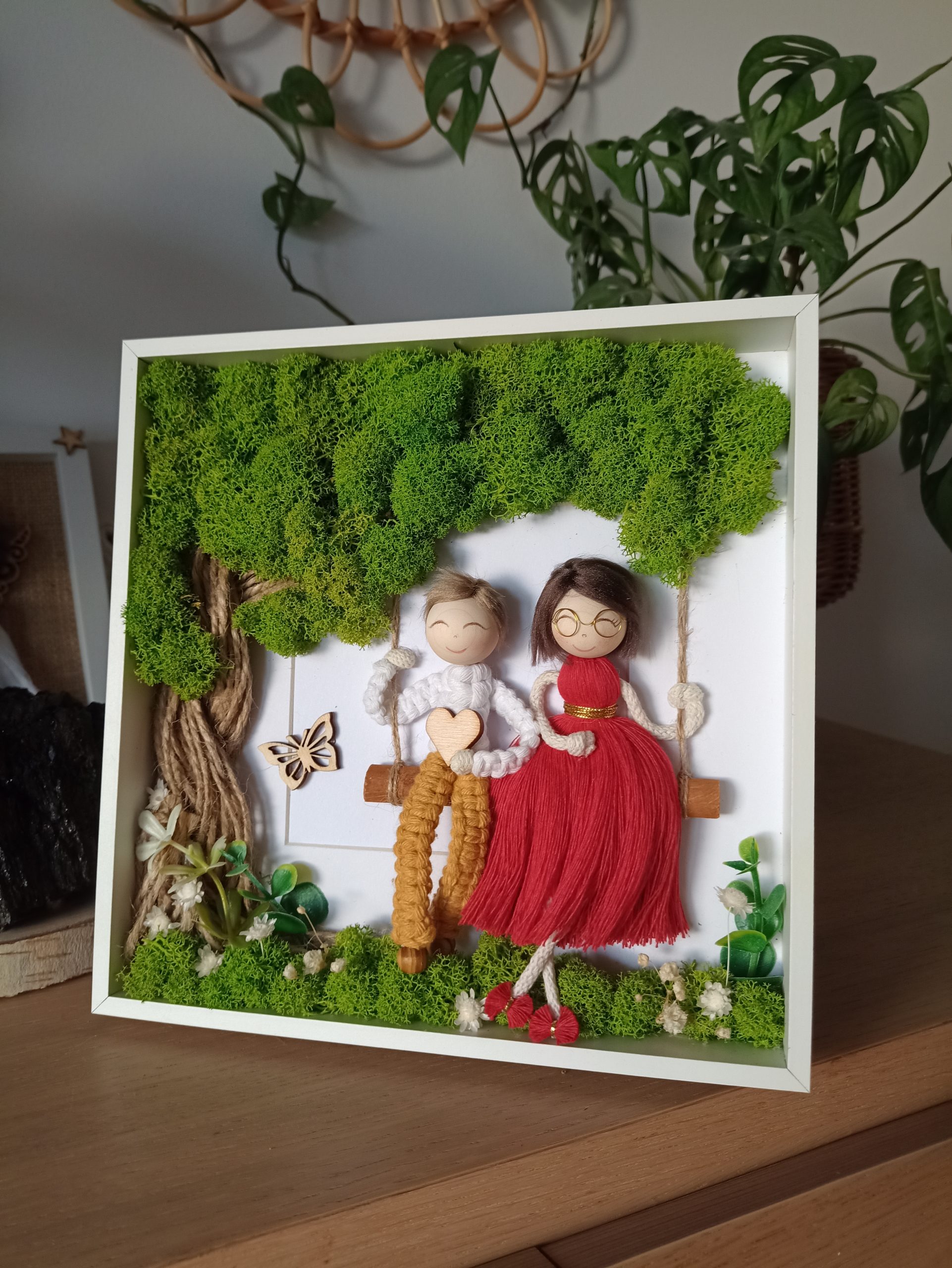 Personalizowana ramka 3D z mchem chrobotkiem i postaciami z makramy to wyjątkowa dekoracja handmade, pełna natury, emocji i symboliki.