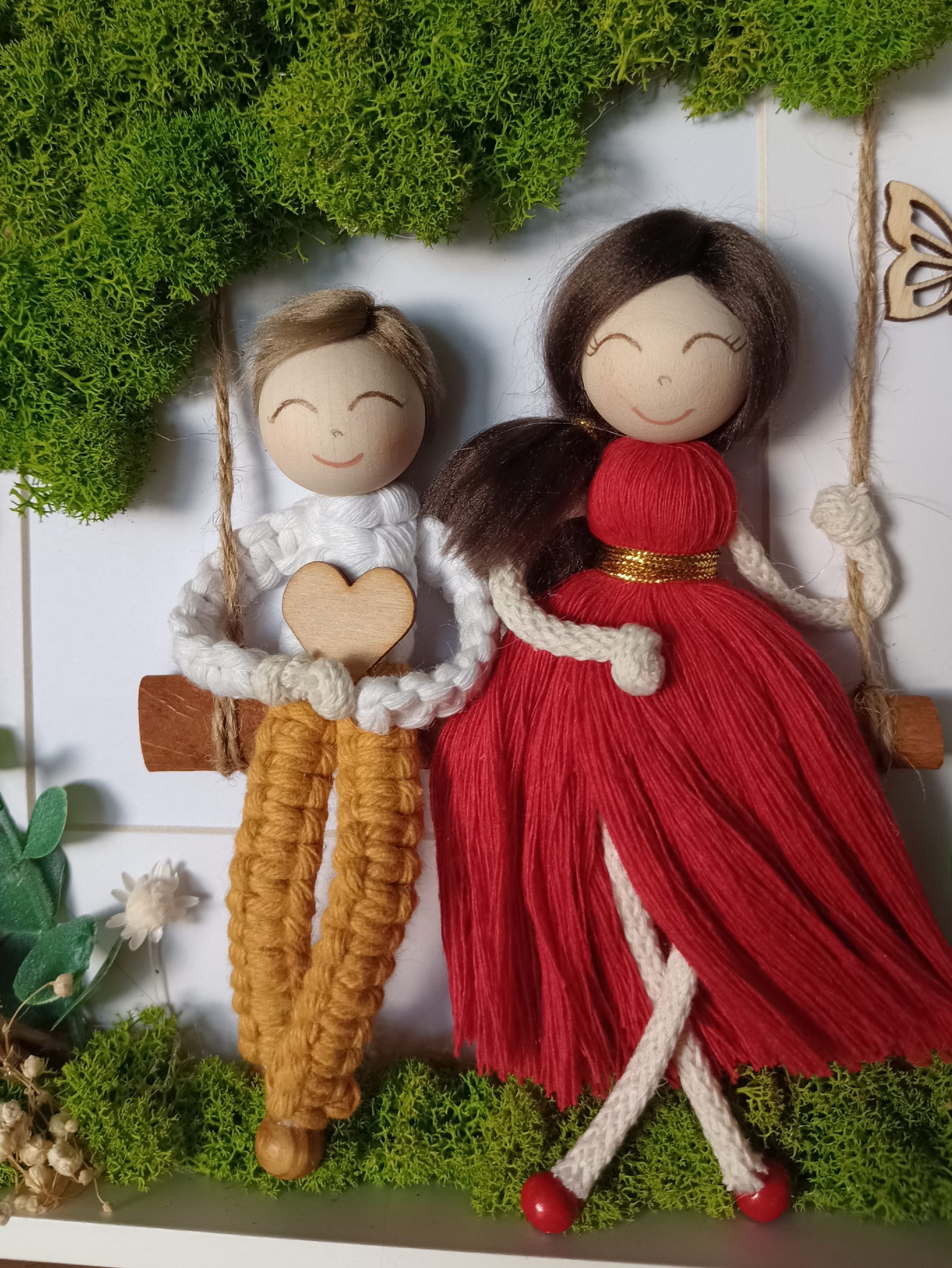 Ramka z mchem chrobotkiem i laleczkami makramowymi